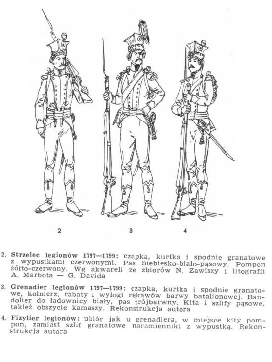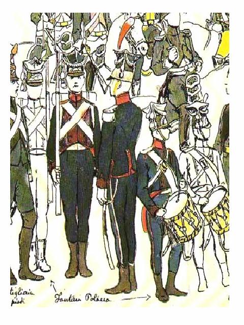 Co do tego okragłego pomponu to w 1 okresie powinien być raczej wzoru francuskiego (rozkaz Dabrowskiego)czyli nie okragły pomponik a coś na kształt marchewki( czerwony dla grenadierów, zielony dla strzelców i niebieski dla fizylierów). Podany przez Pania system byłby całkowicie nie czytelny dla Francuzów, potrzebna była kompatybilność ze wzgledu na współdziałanie w polu. Z tego samego powodu pomimo rozkazu typowe szlify polskie pozostawiono tylko u oficerów a szeregowym i podoficerom przydano szlify francuskie zpolszczone przez zmiane barwy z żółtej (francuskiej) na białą (polska). Szlify oficerskie były oczywiscie srebrne (polskie). Francuskie szlify oficerskie były odmiennego "kroju" i barwy złotej.