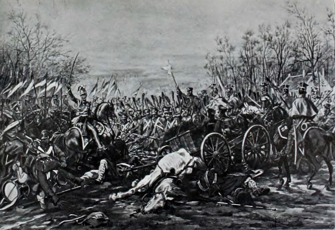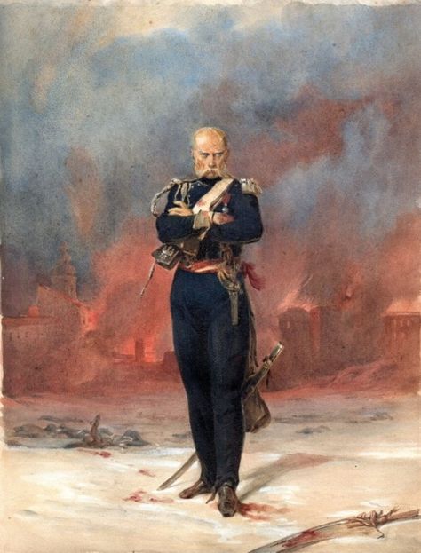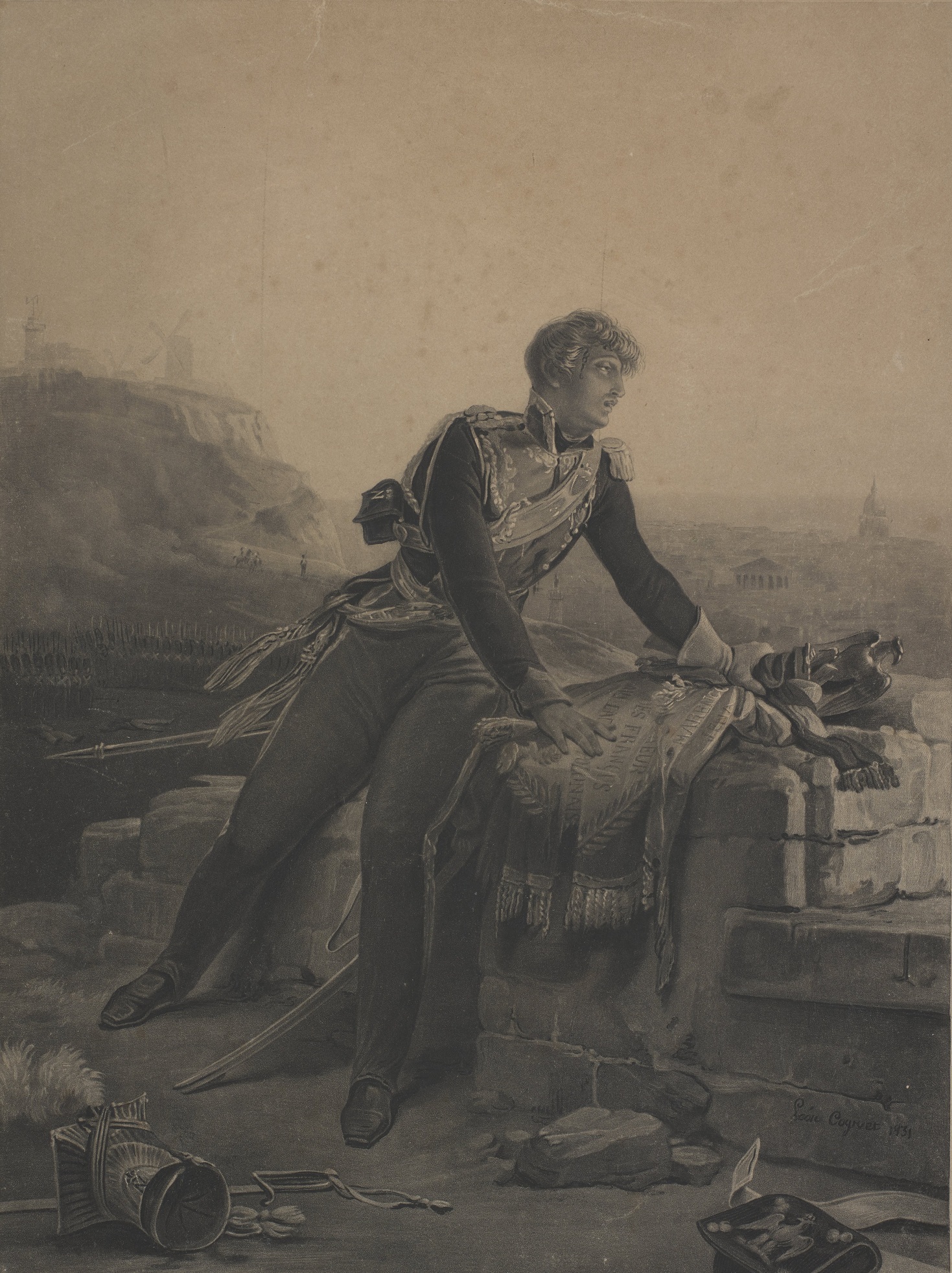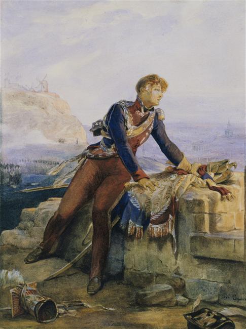 …Ranny oficer siedząc na ruinach umocnień miejskich, spogląda w dal. Wyraz jego twarzy zdaje się mówić: Dziś my się dowiedzieli, że nieprzyjaciel przez zdradę marszałka Marmonta zajął Paryż…