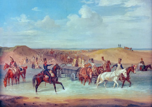 „Widzieliśmy tam nawet wielkie kłęby dymu, unoszące się ku niebu i doszliśmy do wniosku, że nie możemy być daleko od moskiewskiej drogi pocztowej, wzdłuż której maszerowała nasza główna kolumna. [Mogły to być tylko armaty Seruziera, znów w kontakcie z nieprzyjacielem.] Widzimy potem rosyjską jazdę, jak zbiera się w oddali, z wyraźnym jednak zamiarem zagrodzenia nam drogi. Wicekról rozkazuje włoskiemu 3 Pułkowi Szaserów atakować".