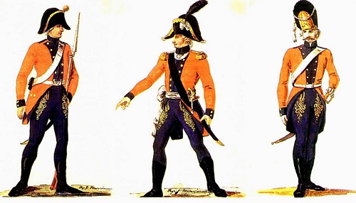 Żołnierz, oficer i grenadier gwardii pieszej Wielkiego Księstwa Litewskiego w mundurze z 1792 r. mal. Józef Harasimowicz.