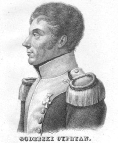 Cyprian Godebski (1765-1809) Wszechstronnie uzdolniony literacko, w młodości kształcił się na prawnika. Wziął udział w przygotowaniach do insurekcji 1794 r. a następnie konspiracji wołyńskiej w ramach Centralizacji Lwowskiej. Zagrożony aresztowaniem, zdołał uciec do Włoch, gdzie zgłosił się do Legionów. Pomimo braku przygotowania i doświadczenia wojskowego został przyjęty jako oficer nadliczbowy. Zaangażował się w działalność oświatową wśród legionistów, redagował „Dekadę Legionową”. Pod Magnano został ciężko ranny w obronie sztandaru, za co został awansowany na por. W oblężonej Mantui przebywał w szpitalu, a po jej kapitulacji wyruszył o kulach do Lyonu. Swoje przeżycia opisał w poemacie „Grenadier-filozof”. W Legii Naddunajskiej awansowany do stopnia kpt., uczestniczył w walkach nad Renem. W 1801 r. wrócił do kraju, gdzie m.in. zajął się wydawaniem „Zabaw przyjemnych i pożytecznych”. Mając problemy finansowe najął się jako guwerner. Na wieść o zajęciu Poznania przez Francuzów, pomimo dawnych urazów stanął u boku gen. Dąbrowskiego, włączając się do organizacji wojska polskiego. Zajął się m.in. tłumaczeniem na język polski francuskich regulaminów, oraz kierował wydziałem etatowym w Dyrekcji Wojny ks. Poniatowskiego. Skierowany do korpusu obserwacyjnego gen. Zajączka, wyróżnił się w walkach nad Omulwią na czele pułku kaliskiego 4. pp (późniejszy 8. pp). Zajączek wnioskował do Napoleona o awans generalski dla Godebskiego, ale sprzeciwił się temu ks. Józef. Po pokoju w Tylży został komendantem wojskowym Kalisza. Ceniony przez gen. Zajączka, który oceniał Godebskiego jako „bardzo wykształconego i godnego polecenia oficera, mającego pełne kwalifikacje wojskowe: inteligencję, dzielność, zdolność a nade wszystko patriotyzm i oddanie sprawie publicznej, w takiej mierze jak niewielu”. Podczas bitwy pod Raszynem, został ciężko ranny prowadząc kontratak batalionu 8. Pp. Zmarł w drodze do Warszawy, zyskując sławę bohaterskiego żołnierza-poety.