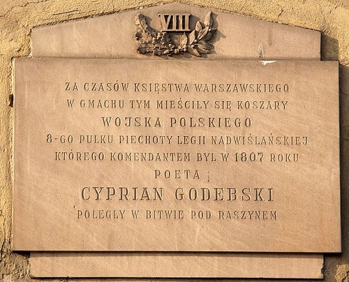 Za czasów Księstwa Warszawskiego / w gmachu tym mieściły się koszary / Wojska Polskiego / 8-go pułku piechoty Legii Nadwiślańskiej / którego komendantem był w 1807 roku / poeta / Cyprian Godebski / poległy w bitwie pod Raszynem