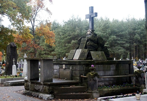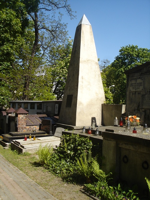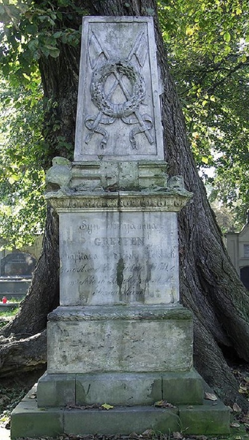 Nagrobek płk Wojciecha Greffena. Nagrobek w formie kilkustopniowego czworobocznego obelisku ozdobionego w najwyższej części płaskorzeźbionymi panopliami (od frontu i od tyłu) oraz żeńską personifikacją żałoby obejmującej krzyż, a nad częścią środkową częściowo zachowanymi rzeźbami m.in. pseudoantycznych hełmów i prawdopodobnie kartuszy herbowych. Na bokach części środkowej obelisku częściowo zatarte inskrypcje: