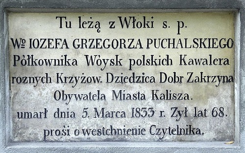 Tu leżą zWłoki s. p. / Wo Iozefa Grzegorza Puchalskiego / Półkownika Wóysk polskich Kawalera / roznych Krzyżow. Dziedzica Dobr Zakrzyna / Obywatela Miasta Kalisza. / umarł dnia 5.Marca 1833 r. Zył lat 68. / prośi o westchnienie Czytelnika.//