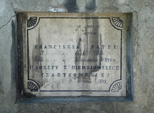 „Miejsce wiecznego spoczynku Matki z Zięciem / ś:p: / FRANCISZKA PATEK/ Pułkownika Wojsk Polskich / Zmarłego d: 6 Października 1844 r. / i JÓZEFY Z NIEMOJOWSKICH / CZARTKOWSKIEJ / Zmarłej d: 19 Sierpnia 1848.”