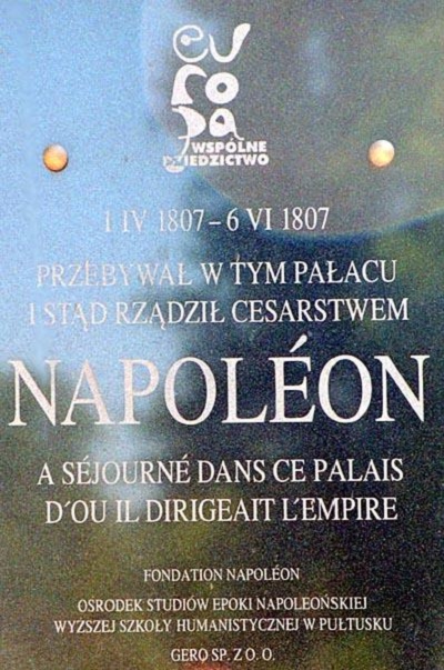 1 IV 1807 – 6 VI 1807 / PRZEBYWAŁ W TYM PAŁACU / I STĄD RZĄDZIŁ CESARSTWEM / NAPOLÉON / A SÉJOURNÉ DANS CE PALAIS / D’OU IL DIRIGEAIT L’EMPIRE / FONDATION NAPOLÉON / OŚRODEK STUDIÓW EPOKI NAPOLEOŃSKIEJ / WYŻSZEJ SZKOŁY HUMANISTYCZNEJ W PUŁTUSKU / GERO SP. Z O.O. //