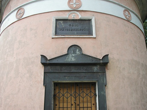 Nad wejściem tablica żeliwna z napisem: „GRÓB WEYSSENHOFFÓW”. Na ozdobnym żeliwnym obramieniu wejścia monogram maryjny, daty: 1843 + 1848 + 1857 i napis: Erecta MDCCCLVIII Anno. Wewnątrz kaplicy żeliwny krzyż. W krypcie trumny ze szczątkami generała i jego małżonki. Na ścianie tabliczka z napisem: „+ JAN WEYSSENHOFF”.