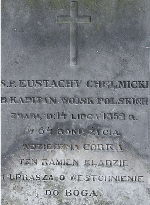 Tablica nagrobna kpt. Eustachego Chełmickiego na grobowcu rodziny Mielęckich na cmentarzu parafialnym. Grobowiec w formie tumby na której znajduje się kopiec z kamieni zwieńczony krzyżem. U jego podnóża tablice nagrobne wykonane z piaskowca. Na jednej z nich ryty krzyż pod którym napis: Ś.P. EUSTACHY CHEŁMICKI / B. KAPITAN WOJSK POLSKICH / ZMARŁ D: 14 LIPCA 1852 R. / W 64 ROKU ŻYCIA / WDZIĘCZNA CÓRKA /TEN KAMIEŃ KŁADZIE / I UPRASZA O WESTCHNIENIE / DO BOGA //
