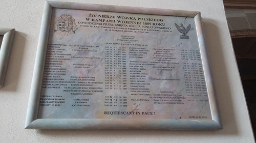 Tablica pamiątkowa w kościele farnym poświęcona zmarłym w lazarecie w Kazimierzu Dolnym, m.in. w wyniku działań wojennych w czasie kampanii 1809 r. Tablica w ramie. Na tablicy godło Księstwa Warszawskiego, orzeł z chorągwi Wojska Polskiego z tego samego okresu oraz napis: Żołnierze Wojska Polskiego / w kampanii wojennej 1809 roku / dowodzonej przez księcia Józefa Poniatowskiego / zmarli od chorób i ran w lazarecie wojskowym w Kazimierzu Dolnym / od 15 czerwca 1809 do 24 lutego 1810 //.
