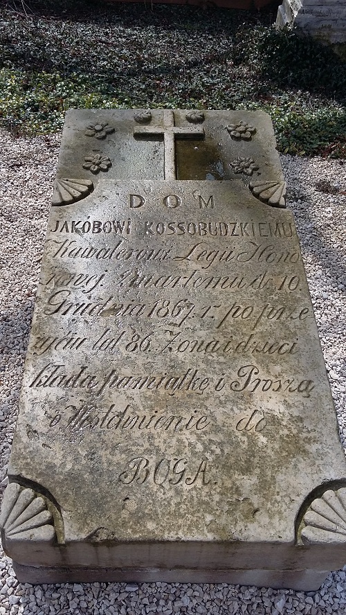 Na kamiennej płycie nagrobnej płaskorzeźbiony krzyż otoczony kwiatami oraz napis: DOM / JAKÓBOWI KOSSOBUDZKIEMU / Kawalerowi Legii Hono / rowej. Zmarłemu d: 10. / Grudnia 1867 r. po prze / życiu lat 86. Żona i dzieci / kładą pamiątkę i Proszą / o Westchnienie do / BOGA. //