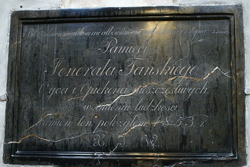 Błogosławieni miłosierni, albowiem oni miłosierdzia dostąpią / Pamięci / JENERAŁA TAŃSKIEGO / Oyca i opiekuna nieszczęśliwych / w imieniu ludzkości / Kamień ten położyłem 1853 r. / X. J. W… //