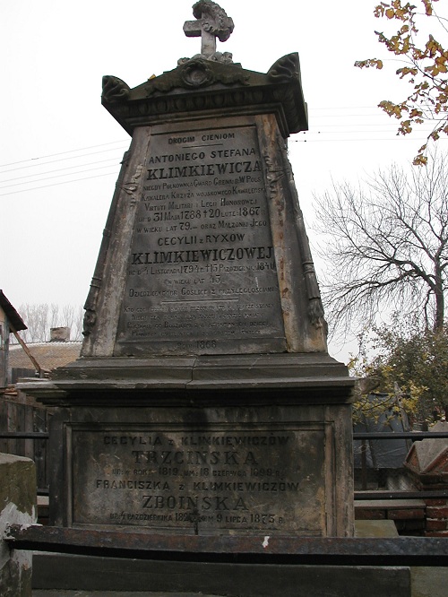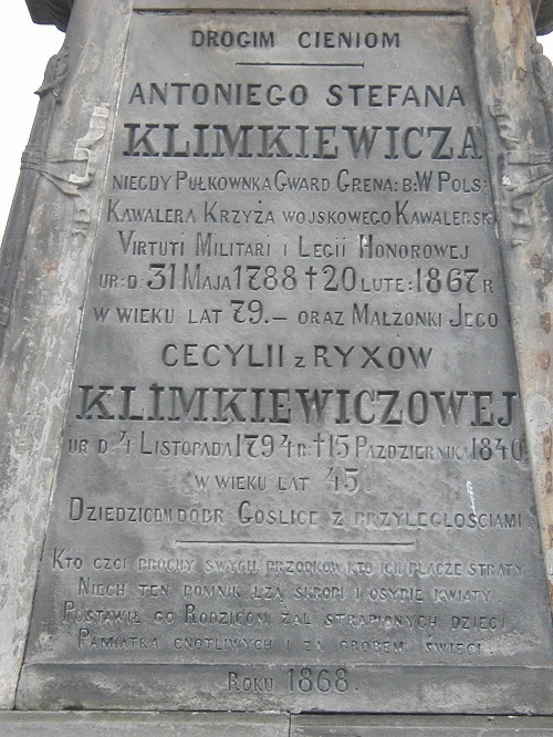 DROGIM CIENIOM / ANTONIEGO STEFANA / KLIMKIEWICZA / NIEGDY [ś] PUŁKOWNIKA GWARD[ii] GRENA:[dierów]: B:[yłego] W[ojska] POLS[kiego] / KAWALERA KRZYŻA WOJSKOWEGO KAWALERSK[iego] / VIRTUTI MILITARI I LEGII HONOROWEJ / UR:[odzony] D:[nia] 31 MAJA 1788 U 20 LUTE:[go] 1867 R[oku] / W WIEKU LAT 79. //