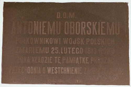 D.O.M / Antoniemu Oborskiemu / pułkownikowi Wojsk Polskich / zmarłemu 25 lutego 1813 roku / żona kładzie tę pamiątkę prosząc / przechodnia o westchnienie za dusze jego //