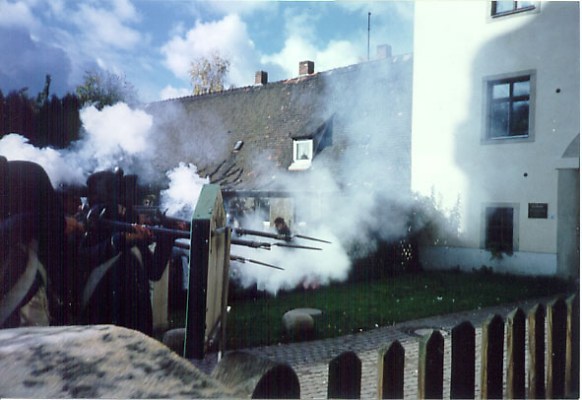 Wszyscy żołnierze powoli przygotowywali się do wymarszu na bitwę. Koło godziny 11.00 wszystkie oddziały uformowały się w kolumnę, maszerując w kierunku Torhaus Wachau. Kiedy dotarliśmy na miejsce doszło do potyczki pod bramą. Marynarze Gwardii, grenadierzy 32. p. p. l. oraz fizylierzy 22 p. p. l. na zmianę salwami z muszkietów odpierali ataki piechoty austriackiej i rosyjskiej. Po owym ostrym starciu wszyscy uczestnicy udali się na poczęstunek i "jedno" piwo. Koło godziny 12.30 wyruszyliśmy dalej całą kolumną w kierunku Liebertwolkwitz. Parę kilometrów mieliśmy do przebycia. Podczas tego marszu spotkaliśmy się z wielką serdecznością okolicznych mieszkańców. Częstowano nas ciastami, cygarami oraz różnego rodzaju destylatami. Miłe to było. W końcu po pewnym czasie dotarliśmy na pola położone na południe od Liebertwolkwitz. Pole bitwy dzielił głęboki na 1,5 metra rów melioracyjny. Po chwili zaczął się obustronny ostrzał artyleryjski, łącznie ze dwadzieścia armat i jeden moździerz. Gdzieniegdzie wyrzucało ziemię na 10 metrów w górę od pozorowanych wybuchów granatów. Naszą "trójkę" przyłączono do saskich szeregów, tragedia!!! "Zielonego pojęcia" nie mieli o musztrze. Gubili szyk, linia się załamywała przy komendzie "zachodź w prawo lub lewo". Nasze cotygodniowe ćwiczenia nie poszły na marne. Najbardziej "przebiegły" był saski oficer piechoty. Na dwa metry przed kolumną Wschodniopruskiej Landwehr'y wydal komendę "przez prawo w tył- naprzód marsz". Sasi!!! Tak samo jak w 1813 roku, "bardzo bojowi"!!! Idealna sytuacja, żeby dostać bagnetem lub piką w plecy od wroga!!! Dookoła grzmiały armaty i paręset muszkietów, zaś w powietrzu unosił się zapach spalonego prochu. Czas się cofnął o 189 lat. Równocześnie na innych odcinkach batalii dochodziło do starć piechoty i kawalerii. Napoleońskie oddziały musiały powoli ustępować pola przeważającym wojskom nieprzyjacielskim. Naszą jedyną drogą ucieczki była kładka przerzucona przez wspominany rów melioracyjny. Zostaliśmy otoczeni, nacierano na nas z trzech stron. Znaleźliśmy się w tak samo niekorzystnym położeniu jak Wielka Armia nad Berezyną. Zabrakło dla wszystkich miejsca na kładce. Mi na szczęście udało się przeskoczyć ten rów, jednak wielu żołnierzy wpadło do zimnej wody. Rozgorzały zacięte walki o przeprawę. Chwałą tam się okrył oddział Marynarzy Gwardii. W tym samym czasie z naszej prawej flanki zaczęła nacierać Pruska Landwehr'a. Zirytowani postawą saskich żołnierzy zaprowadziliśmy porządek w szeregu i udało nam się odeprzeć "kolbami" dwa ataki wroga. Ustępując dalej pola, bitwa została zakończona.