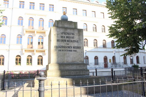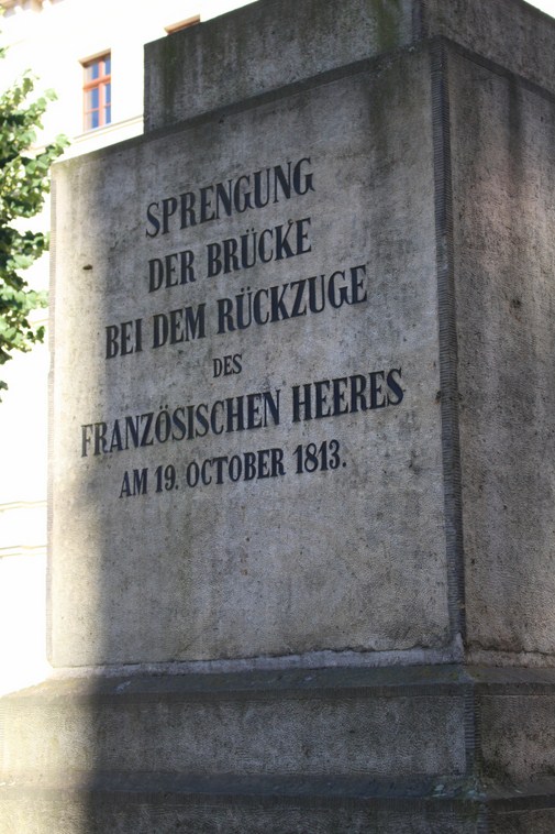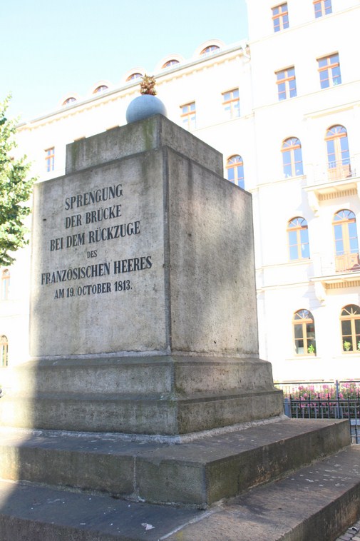 W roku 1863, w roku, kiedy w Lipsku stawiano wiele pomników upamiętniających odbytą 50 lat wcześniej bitwę, postawiono i ten pomnik – Pomnik wysadzonego mostu. Napis zresztą tłumaczy, co w tym miejscu kiedyś było: Most wysadzony podczas odwrotu wojsk francuskich.