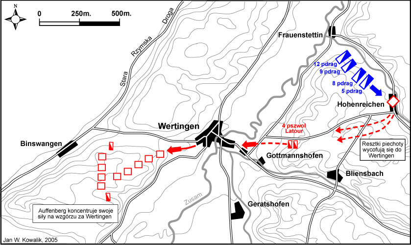 Exelmans widząc manewr odwrotowy austriackiej kawalerii i oceniając ewentualną redutę na wzgórzu pomiędzy Hohenreichen, a Wertingen, jako doskonale nadającą się dla artylerii i bombardowania głównych sił austriackich za Wertingen, postanowił przejąć kontrolę nad Hohenreichen.