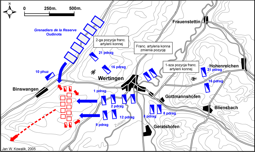 Sześć batalionów austriackich grenadierów było przygotowani na przyjęcie francuskiej szarży francuskiej. Od ich pierwszej zmasowanej salwy padł koń pod Exelmansem. W trakcie zwarcia bezpośredniego, ranny bagnetem został płk Pierre Maupetit, jednak w chaosie bitewnym udało mu się uratować. Szarża trzech brygad dragonów francuskich nie była jednak w stanie przełamać oporu żadnego z dziewięciu batalionowych czworoboków. Exelmans dosiadł nowego konia, a 9. i 12. pułk dragonów pod osłoną francuskiej artylerii na wzgórzu, uporządkowały się i sformowały ponownie w płytkiej dolince pomiędzy Wertingen, a austriackimi czworobokami. Do nowej szarży kompanie wyborcze obydwu pułków zostały ześrodkowane pod osobistą komendą Exelmansa.